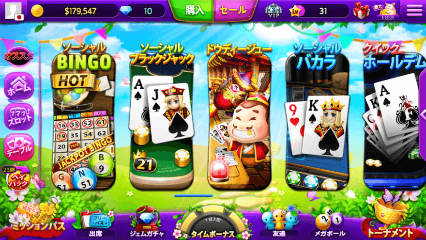 スロットだけでなくカードゲームも豊富なので気分を変えながらずっと遊べるのが特長。ひとつひとつのクオリティも高いので飽きずに遊べることが間違いなし。