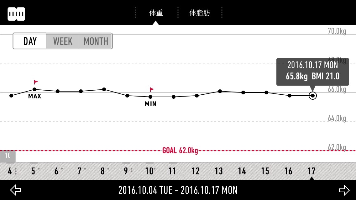 9/28~9/29でガクッと落ちているのは体重の記録するタイミングを夕食後→朝飯前に変更したからです。そう考えると横ばい。