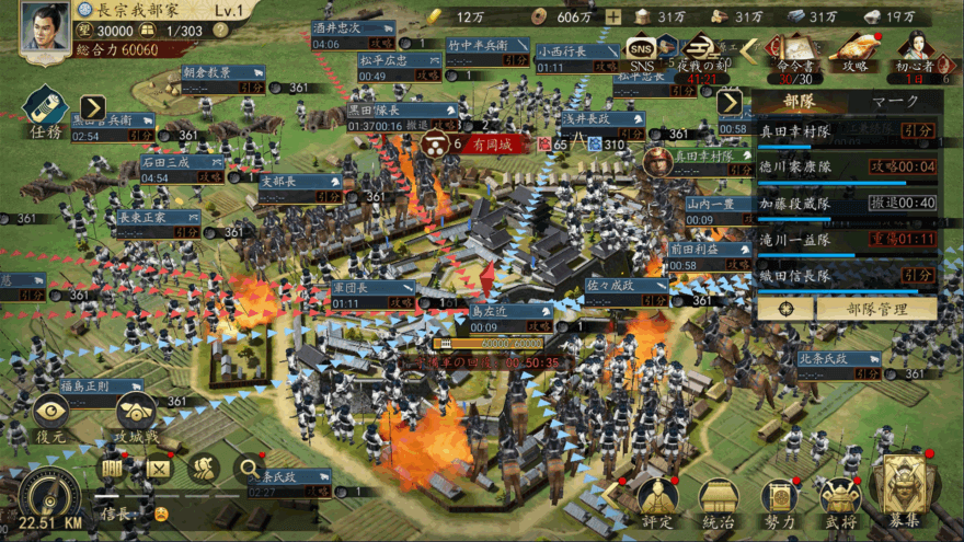 序盤はコツコツ自身の拠点を発展させよう。周りは同盟国ばかりなので敵にのみ集中できる。戦国時代を舞台に、自由度の高いストラテジーゲームを堪能しよう。